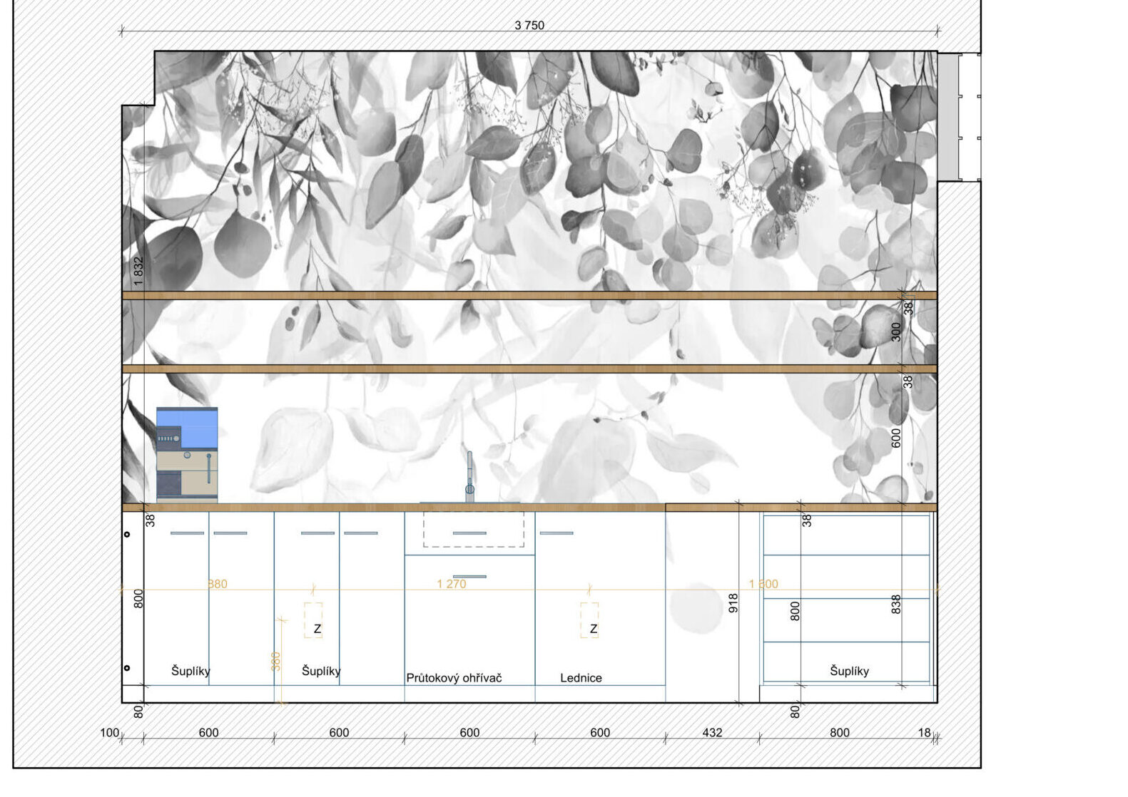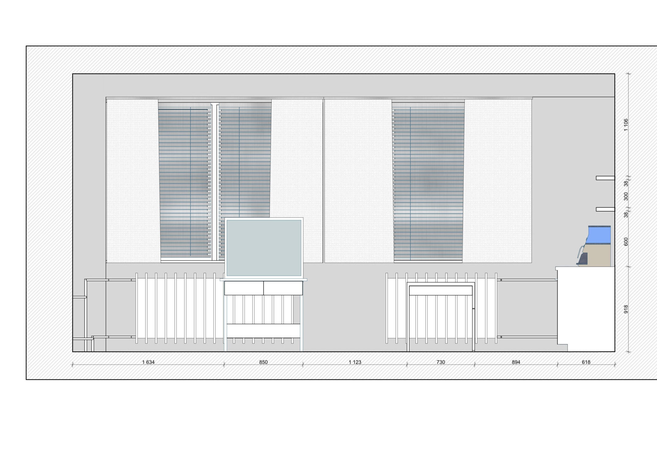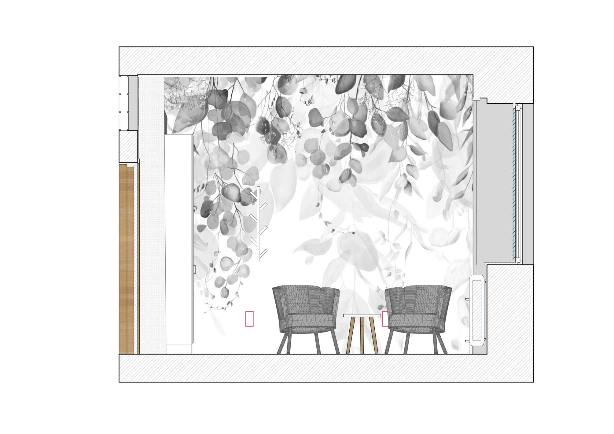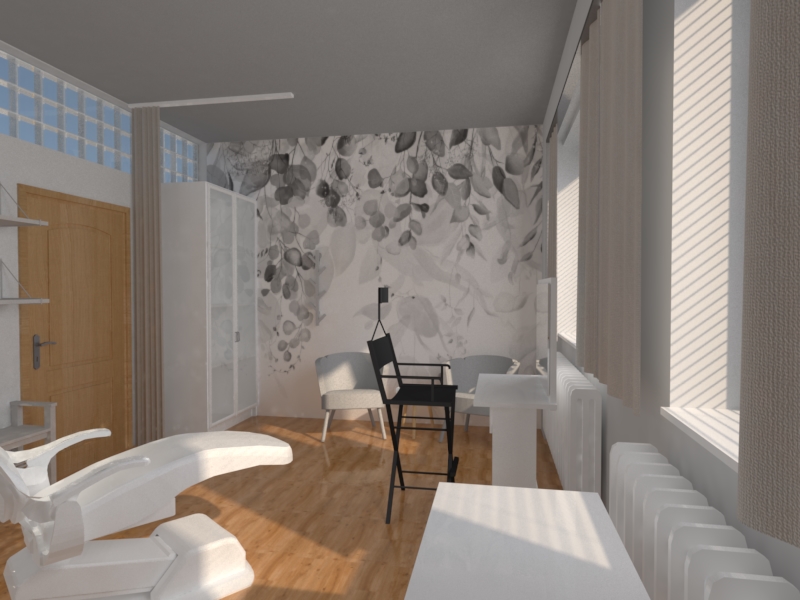 The interior of the beauty salon is conceptually designed as a bright and airy space with subtle decorative accents. The combination of matte light surfaces and oak wood creates an elegant, pleasant environment. Horizontal lines visually widen the space, while large-format floral wallpaper adds visual identity. The design offers variable work settings – from cosmetic care to makeup application and relaxation. The composition incorporates ergonomics and individual client care, supporting the professional and personal aspects of the service.