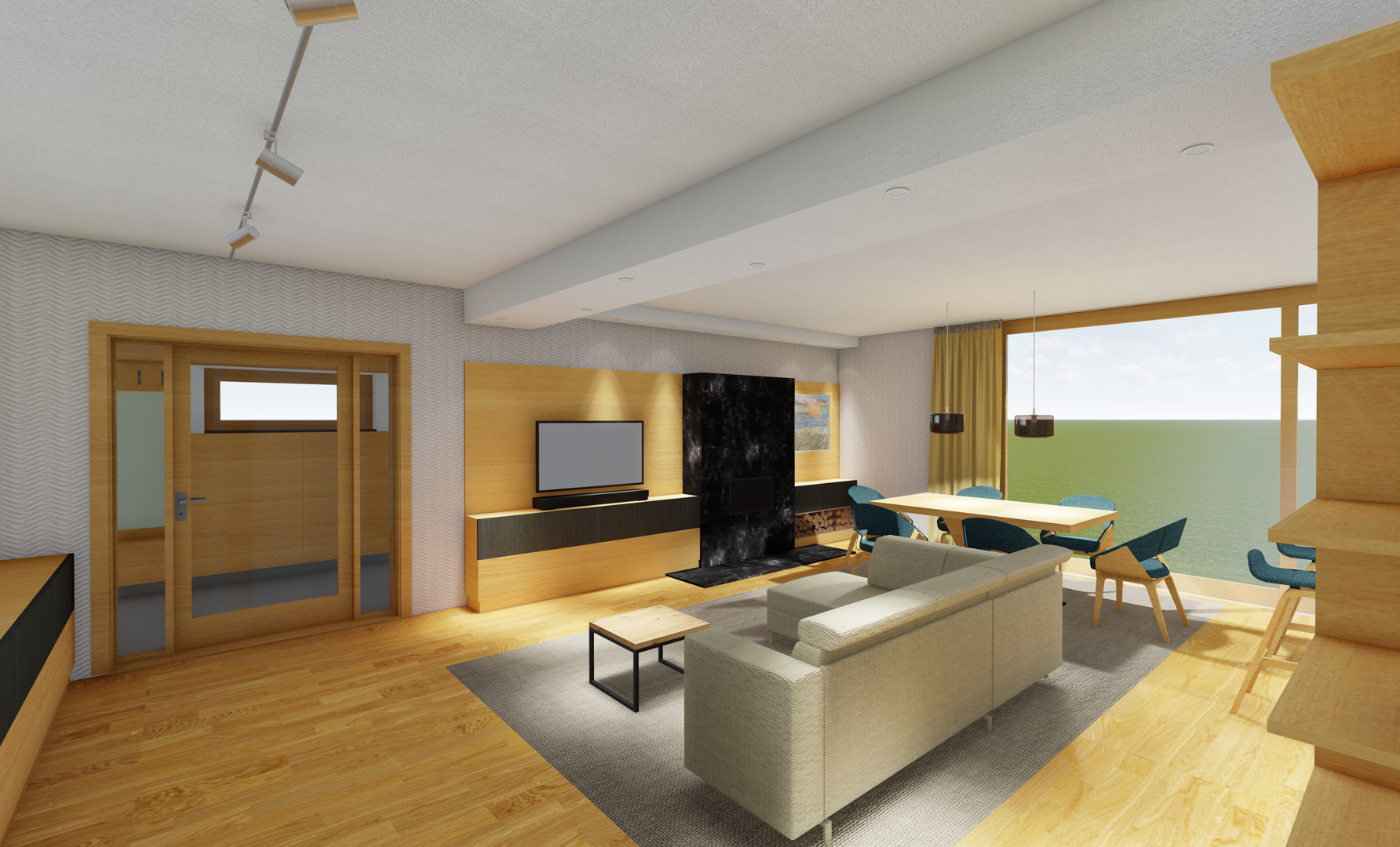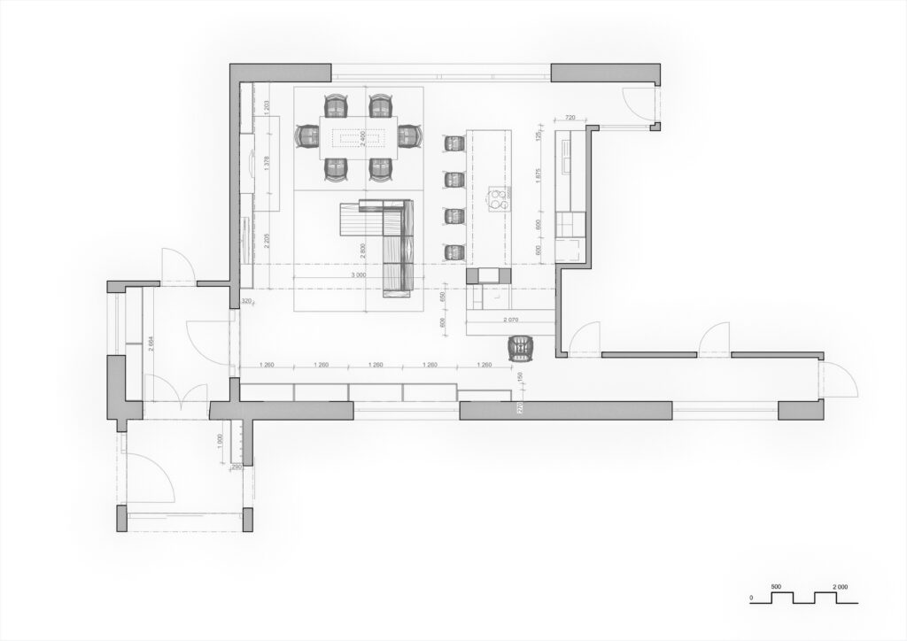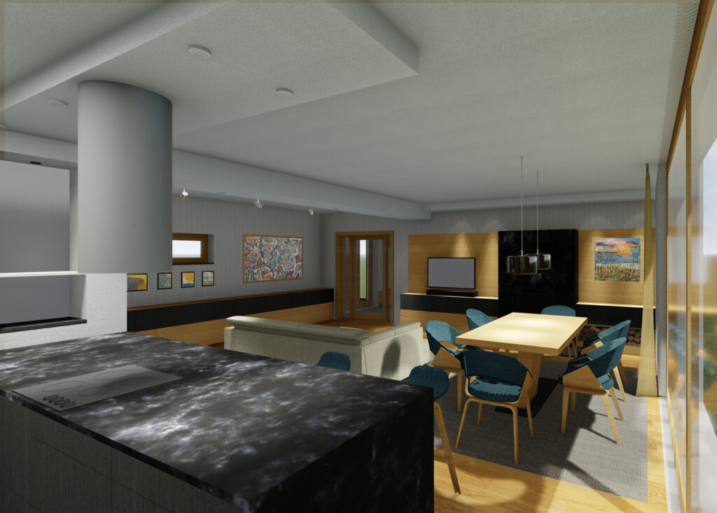 The interior of part of a family house in Baška was designed as a new proposal set within the existing building. The concept is based on respect for the valuable features of the house, especially the fireplace and the kitchen island clad with black marble. The color scheme draws on contrast between black and the warm tones of the wood flooring, creating a harmonious, elegant space rooted in a contemporary minimalist expression and materiality.