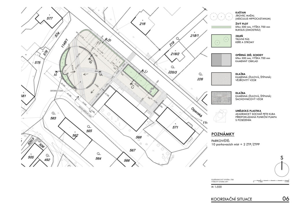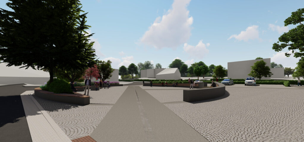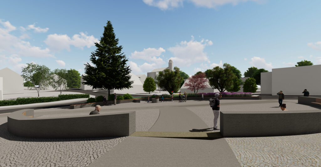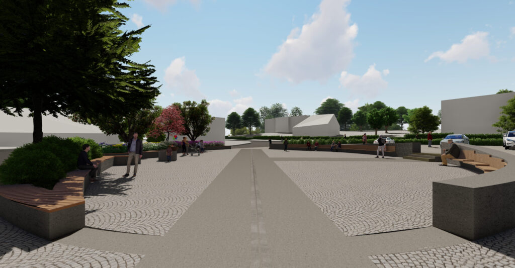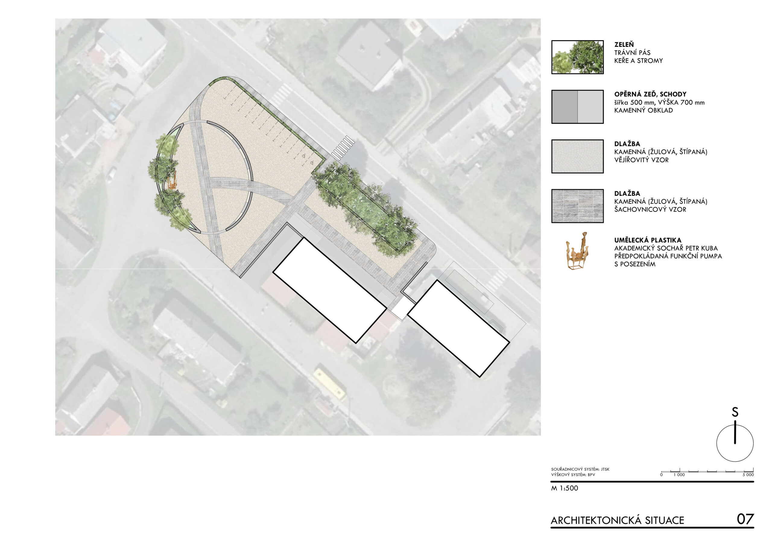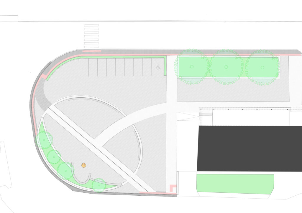 Základním principem návrhu je zachování omezené kapacity parkování při současném vytvoření čitelné centrální pobytové plochy s oválným prostorem pro sezení a drobné komunitní aktivity. Prostorová kompozice pracuje s kombinací pojížděných a pochozích ploch z přírodních materiálů, zejména žulové dlažby a vymývaného betonu, které vytvářejí hierarchii pohybu a pobytu. Důraz je kladen na bezbariérovost, orientaci osob se zrakovým postižením a čitelnost veřejného prostoru prostřednictvím vodicích linií, reliéfních pásů a jasně definovaných hranic mezi jednotlivými funkčními zónami. Studie usiluje o dlouhodobě udržitelnou podobu veřejného prostoru, která respektuje dopravní zátěž lokality a zároveň posiluje její sociální a komunitní význam.