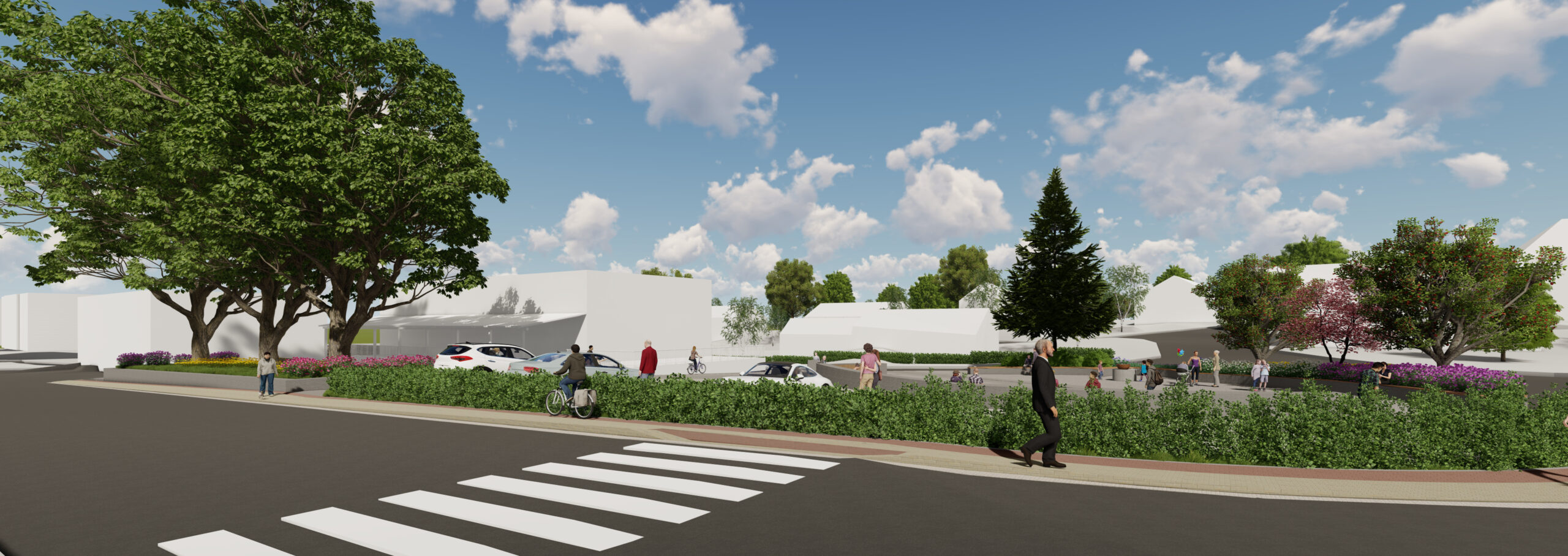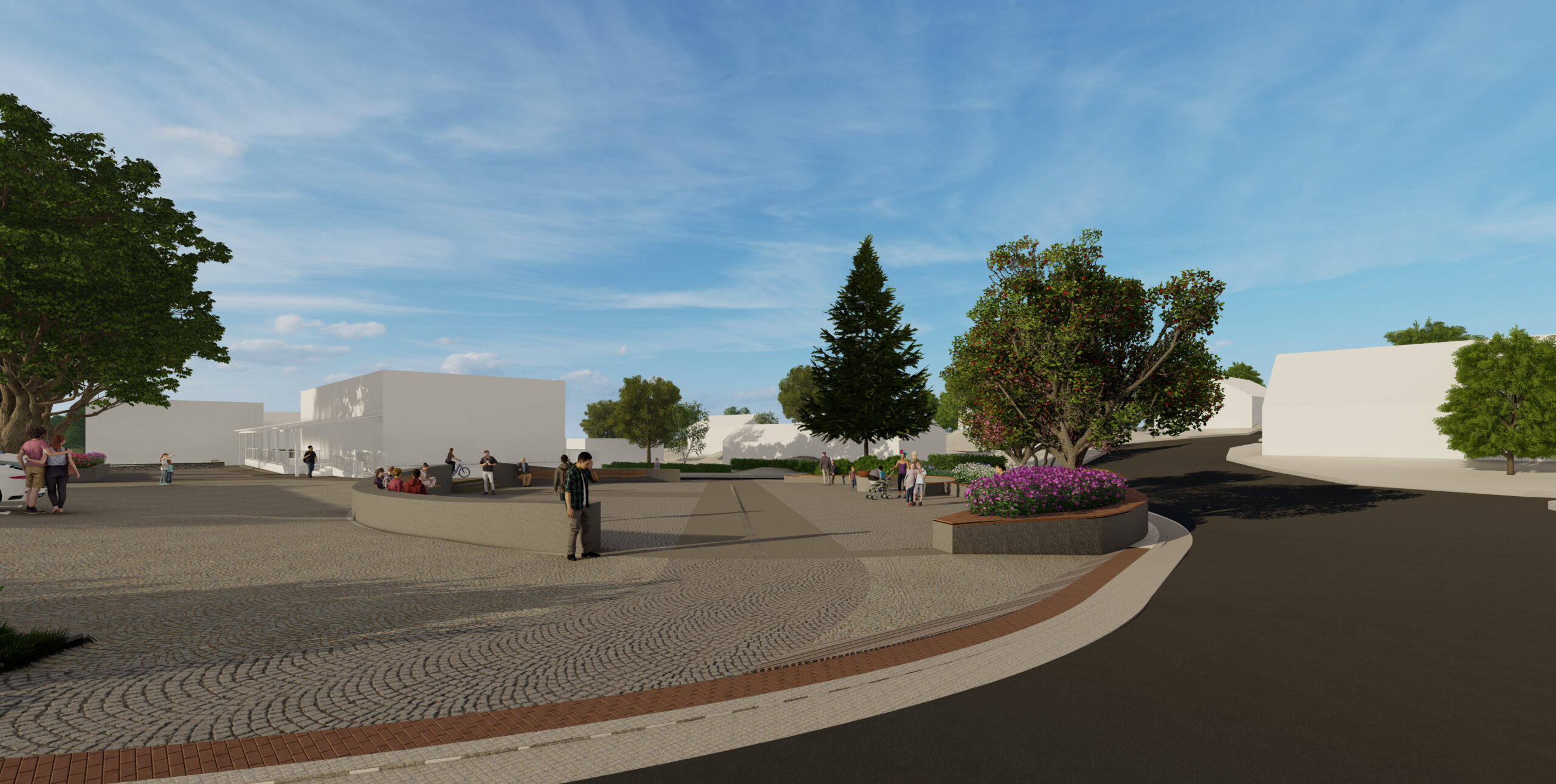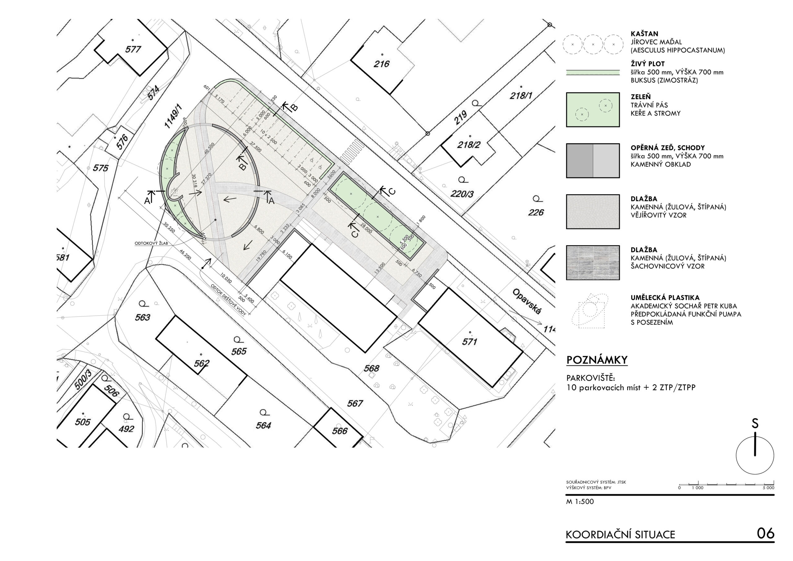 Základním principem návrhu je zachování omezené kapacity parkování při současném vytvoření čitelné centrální pobytové plochy s oválným prostorem pro sezení a drobné komunitní aktivity. Prostorová kompozice pracuje s kombinací pojížděných a pochozích ploch z přírodních materiálů, zejména žulové dlažby a vymývaného betonu, které vytvářejí hierarchii pohybu a pobytu. Důraz je kladen na bezbariérovost, orientaci osob se zrakovým postižením a čitelnost veřejného prostoru prostřednictvím vodicích linií, reliéfních pásů a jasně definovaných hranic mezi jednotlivými funkčními zónami. Studie usiluje o dlouhodobě udržitelnou podobu veřejného prostoru, která respektuje dopravní zátěž lokality a zároveň posiluje její sociální a komunitní význam.
