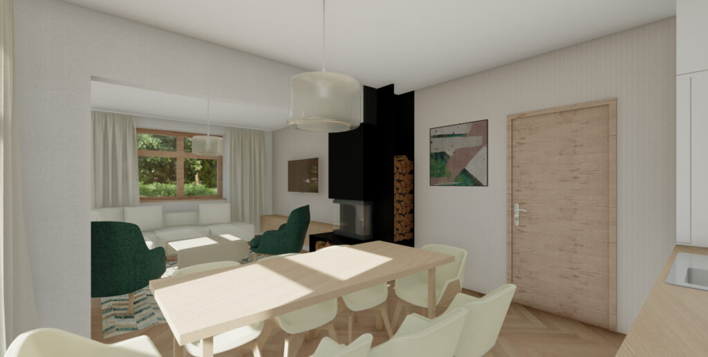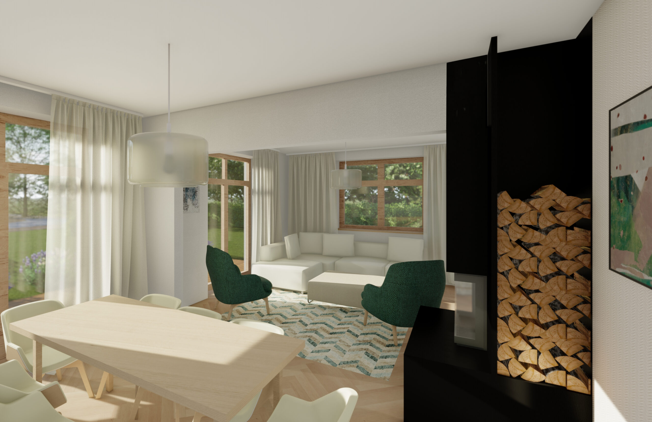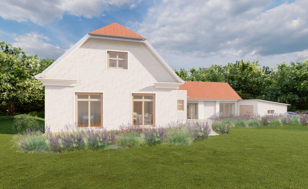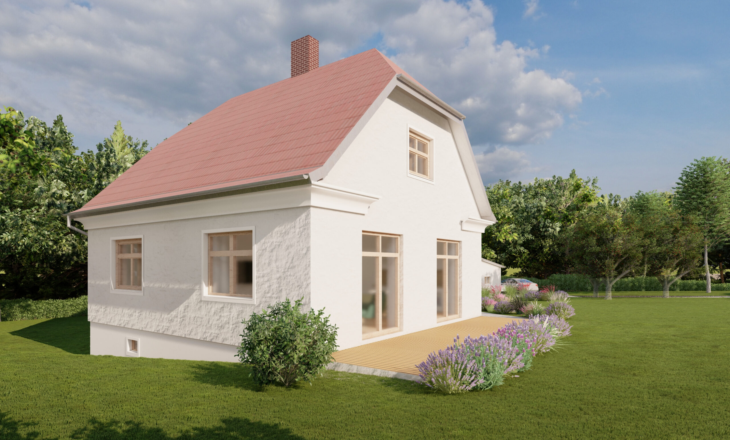 The study of the reconstruction of the building for recreational housing rearranges the layout with an emphasis on the opening of the space, natural lighting, and connection with the exterior. A spacious kitchen with a dining room and living area is created on the ground floor, complemented by a fireplace and direct access to the terrace. The attic is transformed into an open-plan loft with areas for work, relaxation, and social activities. The exterior preserves the historical window mouldings and plaster in the color of unbleached cloth. The project includes the conversion of a farm building into a summer kitchen and an apartment. The architectural expression combines tradition and contemporary lifestyle.