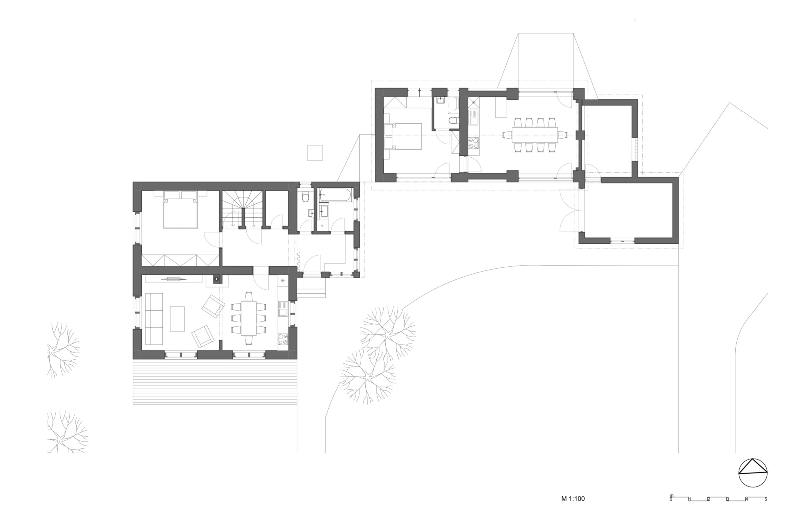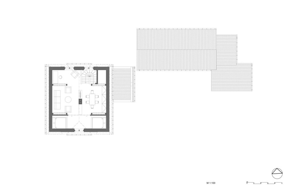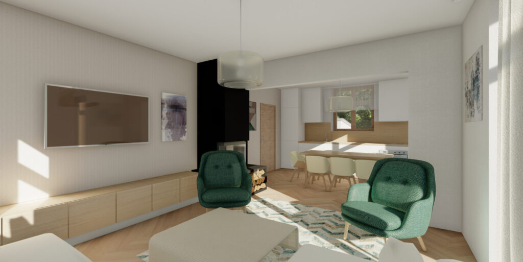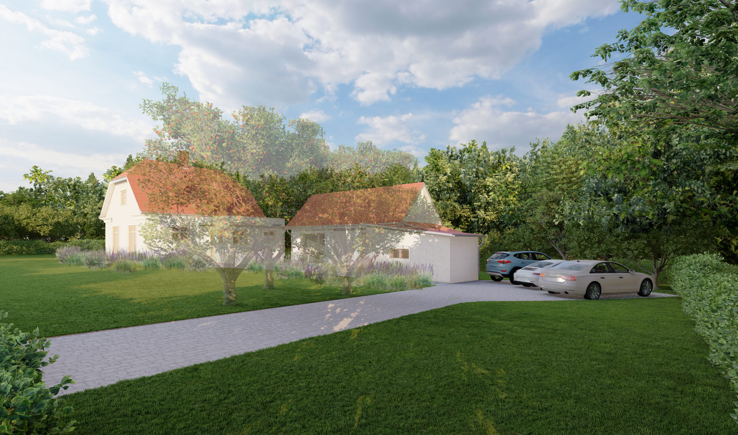 The study of the reconstruction of the building for recreational housing rearranges the layout with an emphasis on the opening of the space, natural lighting, and connection with the exterior. A spacious kitchen with a dining room and living area is created on the ground floor, complemented by a fireplace and direct access to the terrace. The attic is transformed into an open-plan loft with areas for work, relaxation, and social activities. The exterior preserves the historical window mouldings and plaster in the color of unbleached cloth. The project includes the conversion of a farm building into a summer kitchen and an apartment. The architectural expression combines tradition and contemporary lifestyle.