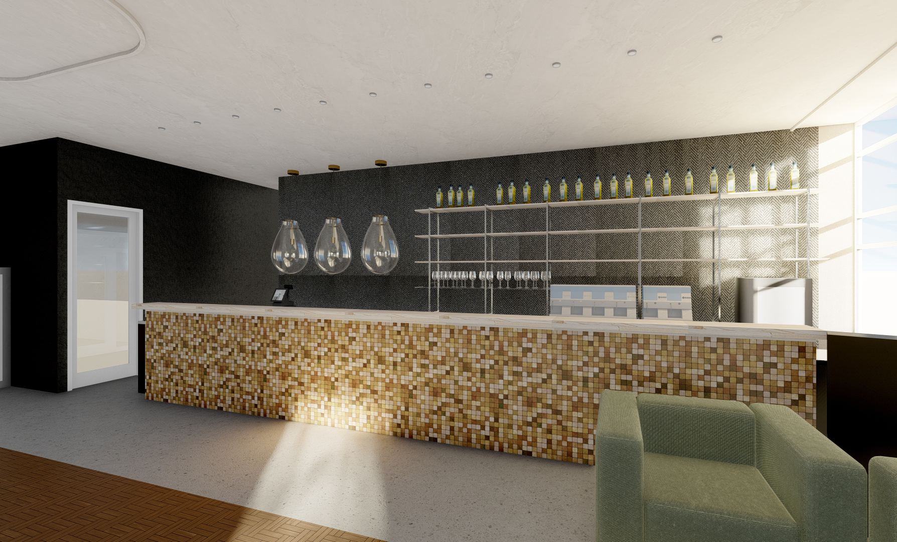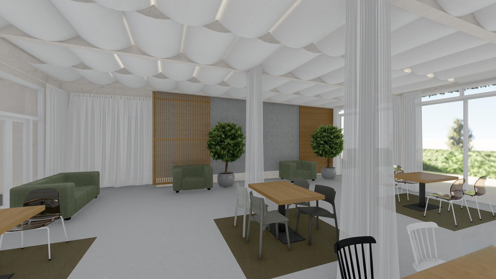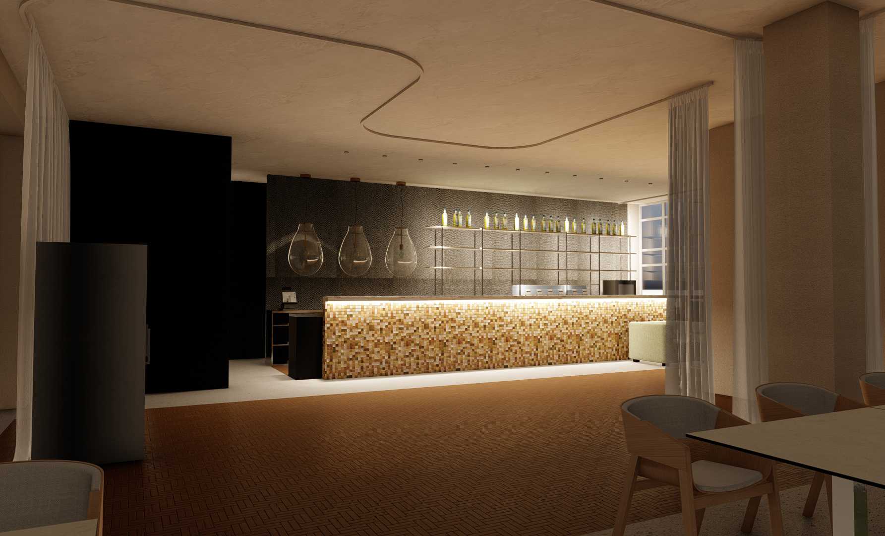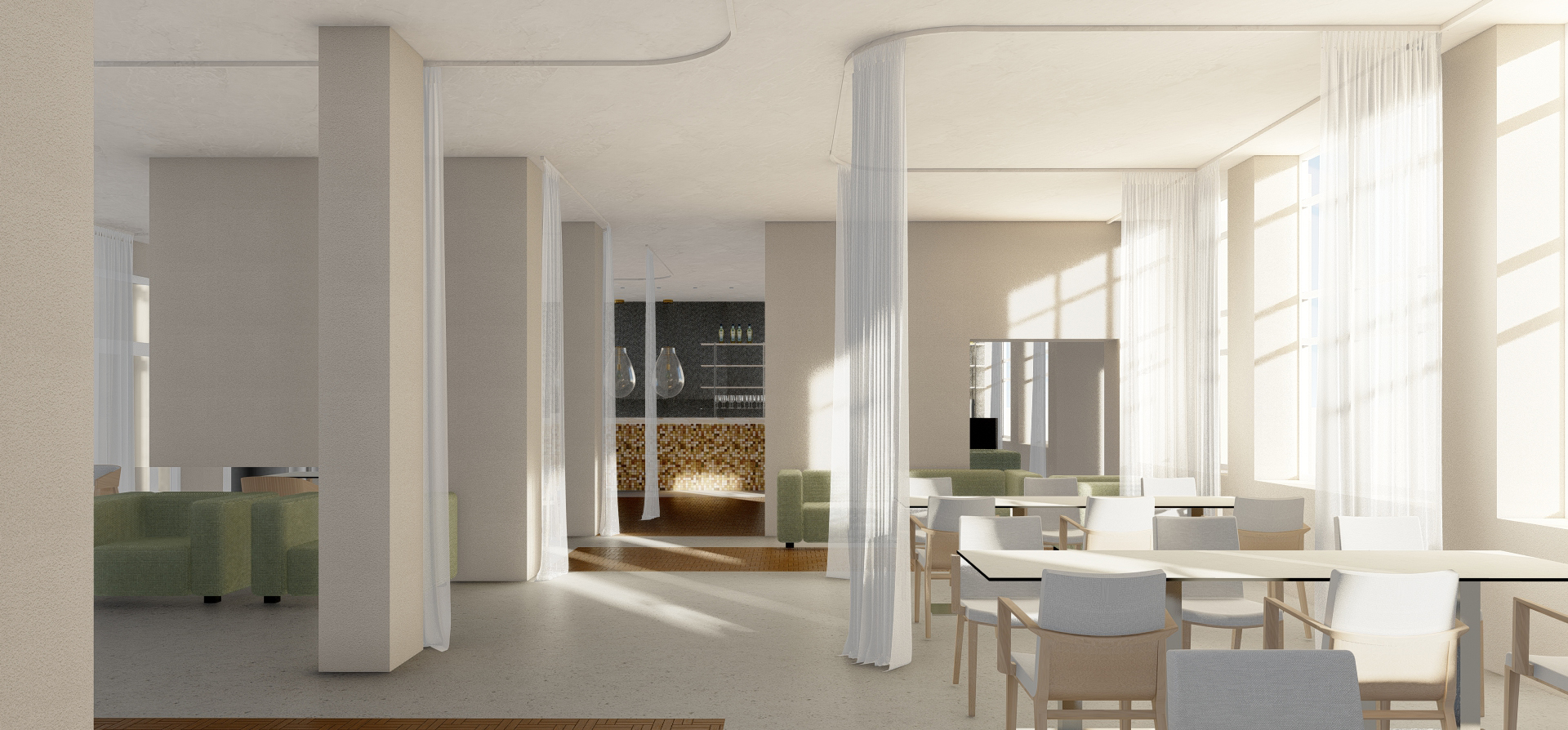 Obnova interiéru restaurace SOHO reagovala na potřebu modernizace a rozšíření klientely. Základní ambicí bylo prostor prosvětlit, očistit a zvýraznit jeho kvalitní prvky, které zůstaly zachovány a doplněny novými materiály. Nevhodné a technicky nevyhovující části byly odstraněny a nahrazeny textilními prvky a tapetami s přírodním abstraktním motivem. Koncept pracuje s bílou jako sjednocujícím motivem a vytváří svěží, přívětivé prostředí podporující komfort hostů.