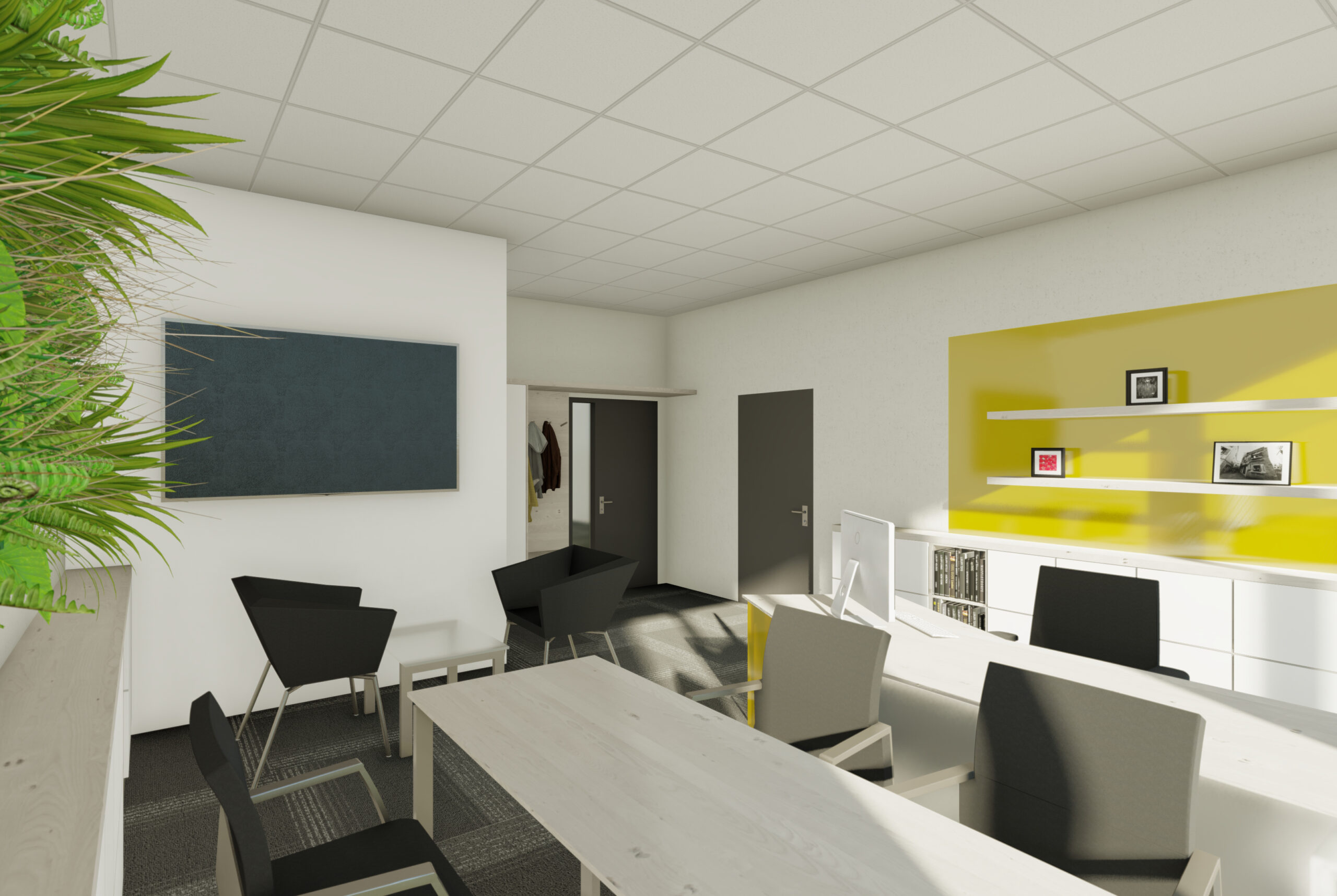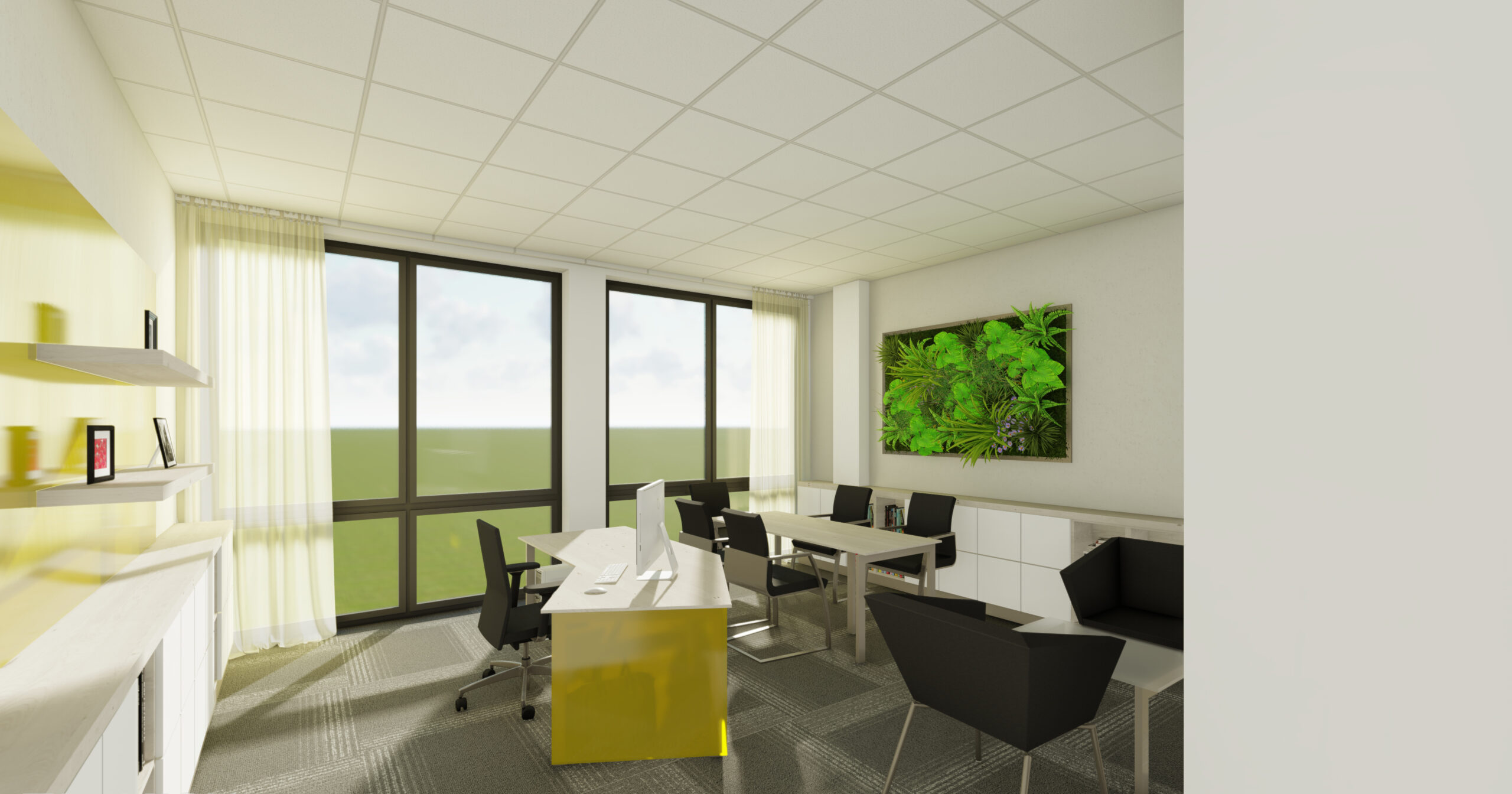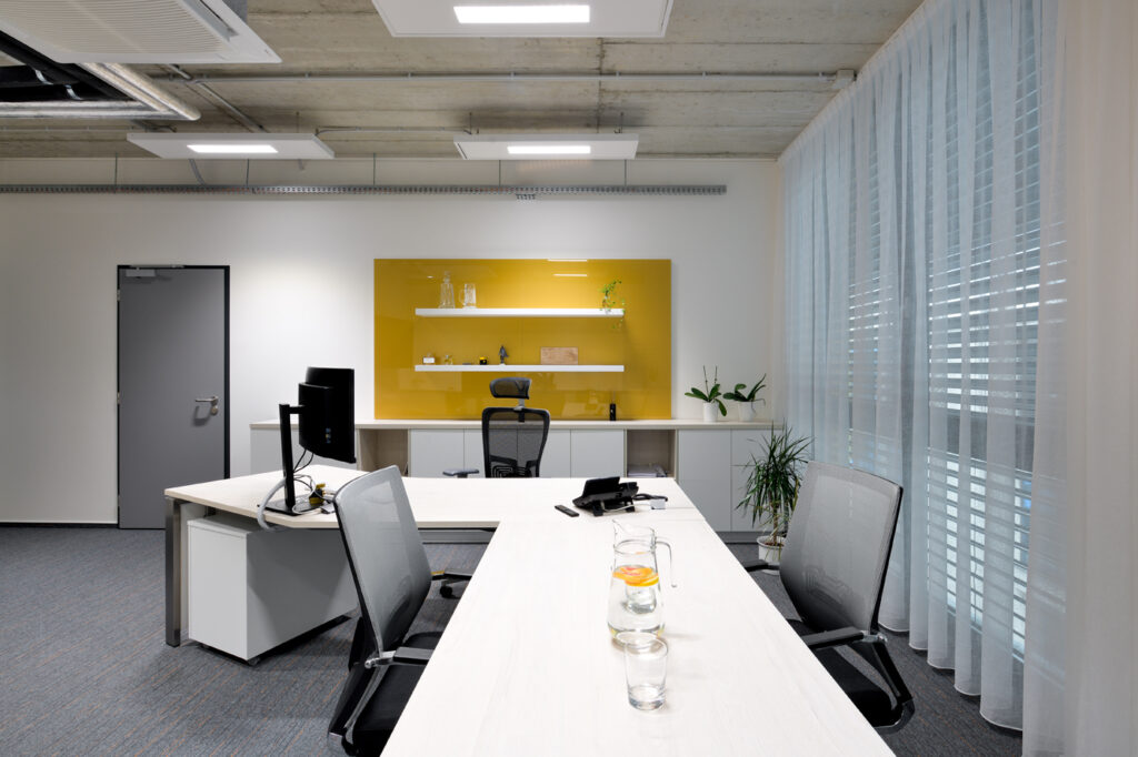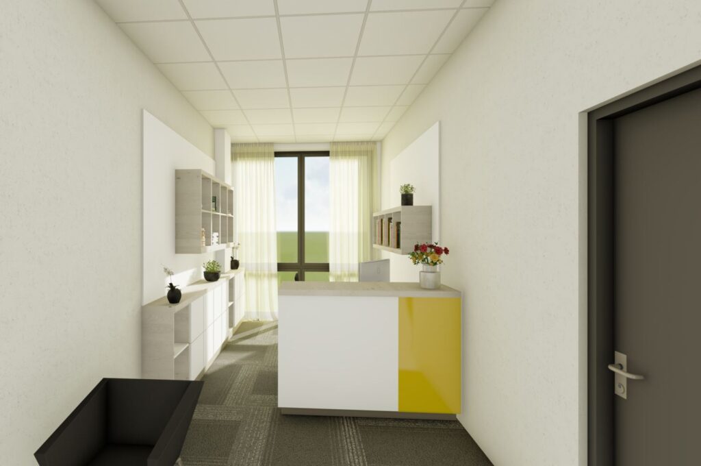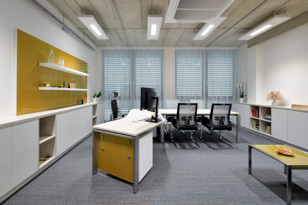 Návrh interiéru kanceláře CEET pracuje s optickým zvětšením prostoru a čistým moderním výrazem. Koncept kombinuje světlé lesklé materiály s barevným sklem, doplněné žlutými akcenty. Interiér umožňuje několik forem práce — od neformálního posezení po formální porady i individuální soustředěnou činnost. Tvar kancelářského stolu akcentuje soukromí uživatele a prostorové vymezení. Zelené prvky a umělecký obraz vnášejí do prostředí měkkost a vizuální rovnováhu. Návrh reflektuje funkční potřeby dynamického pracovního prostoru.