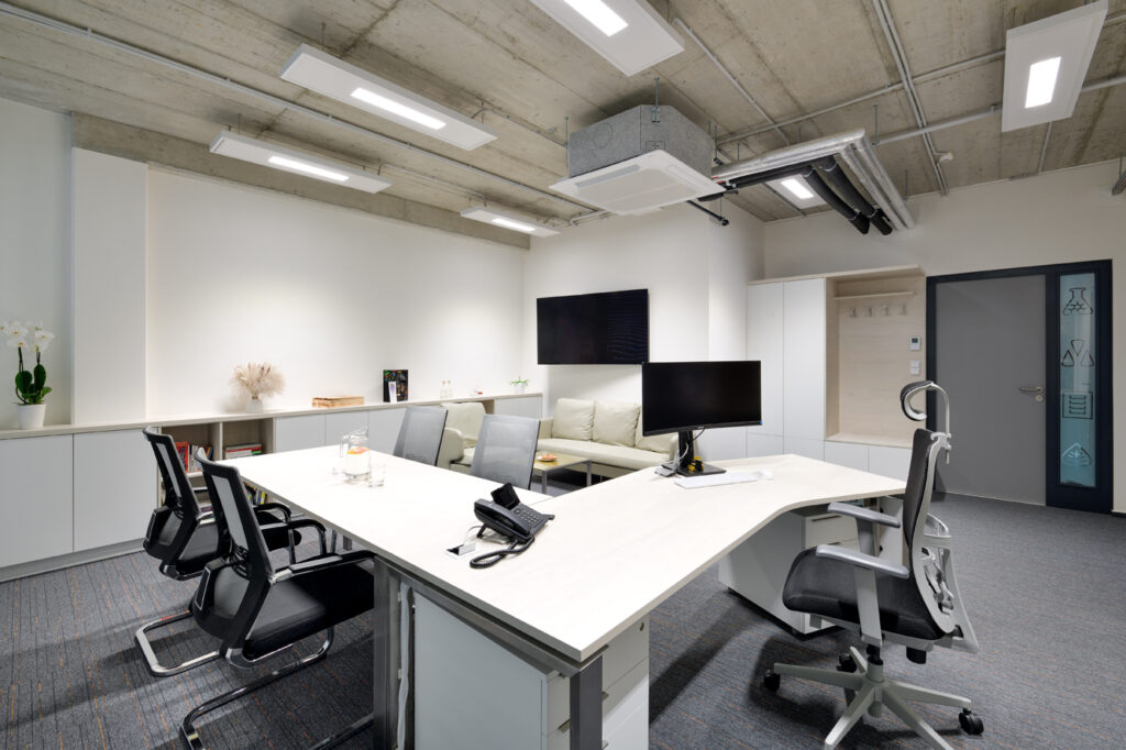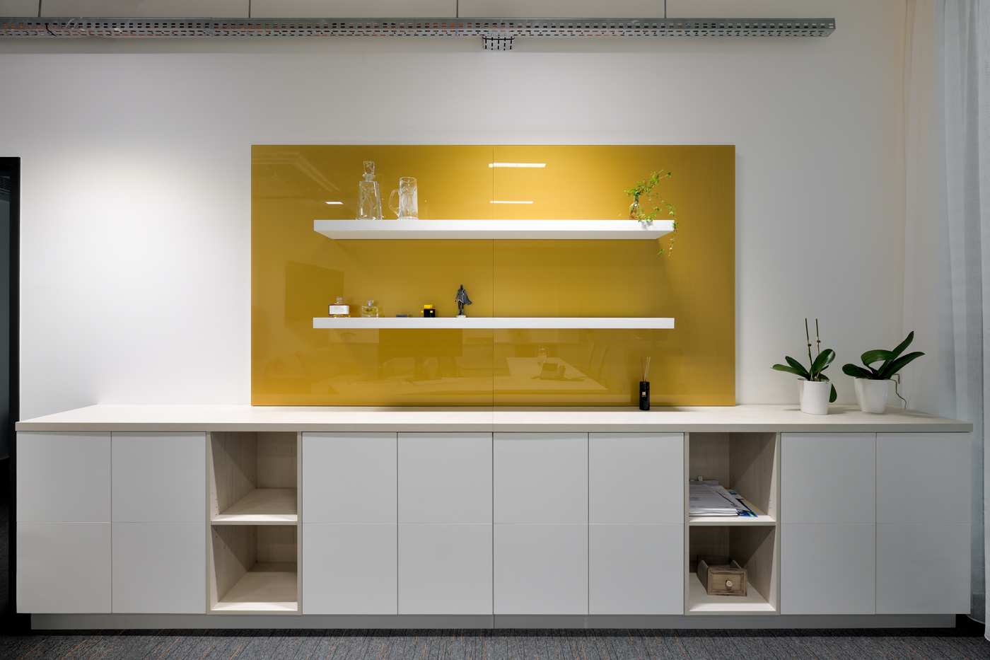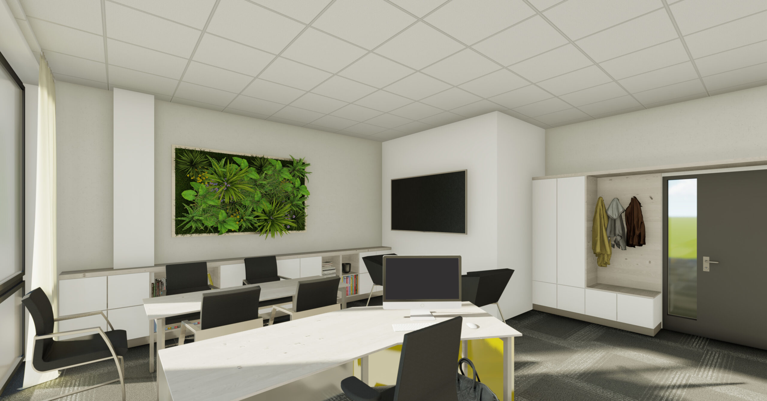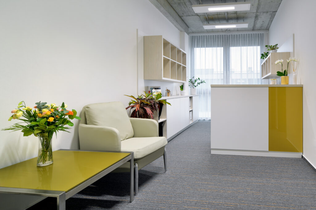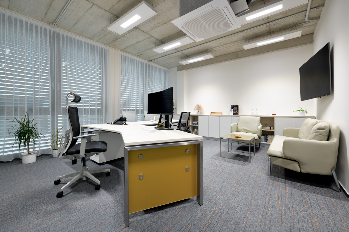 Návrh interiéru kanceláře CEET pracuje s optickým zvětšením prostoru a čistým moderním výrazem. Koncept kombinuje světlé lesklé materiály s barevným sklem, doplněné žlutými akcenty. Interiér umožňuje několik forem práce — od neformálního posezení po formální porady i individuální soustředěnou činnost. Tvar kancelářského stolu akcentuje soukromí uživatele a prostorové vymezení. Zelené prvky a umělecký obraz vnášejí do prostředí měkkost a vizuální rovnováhu. Návrh reflektuje funkční potřeby dynamického pracovního prostoru.