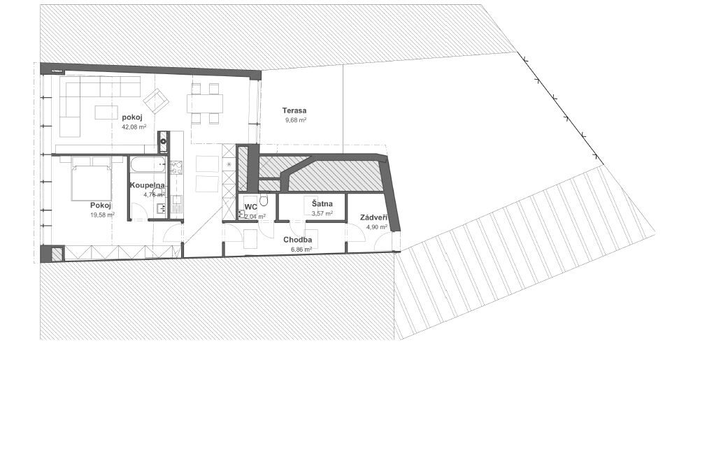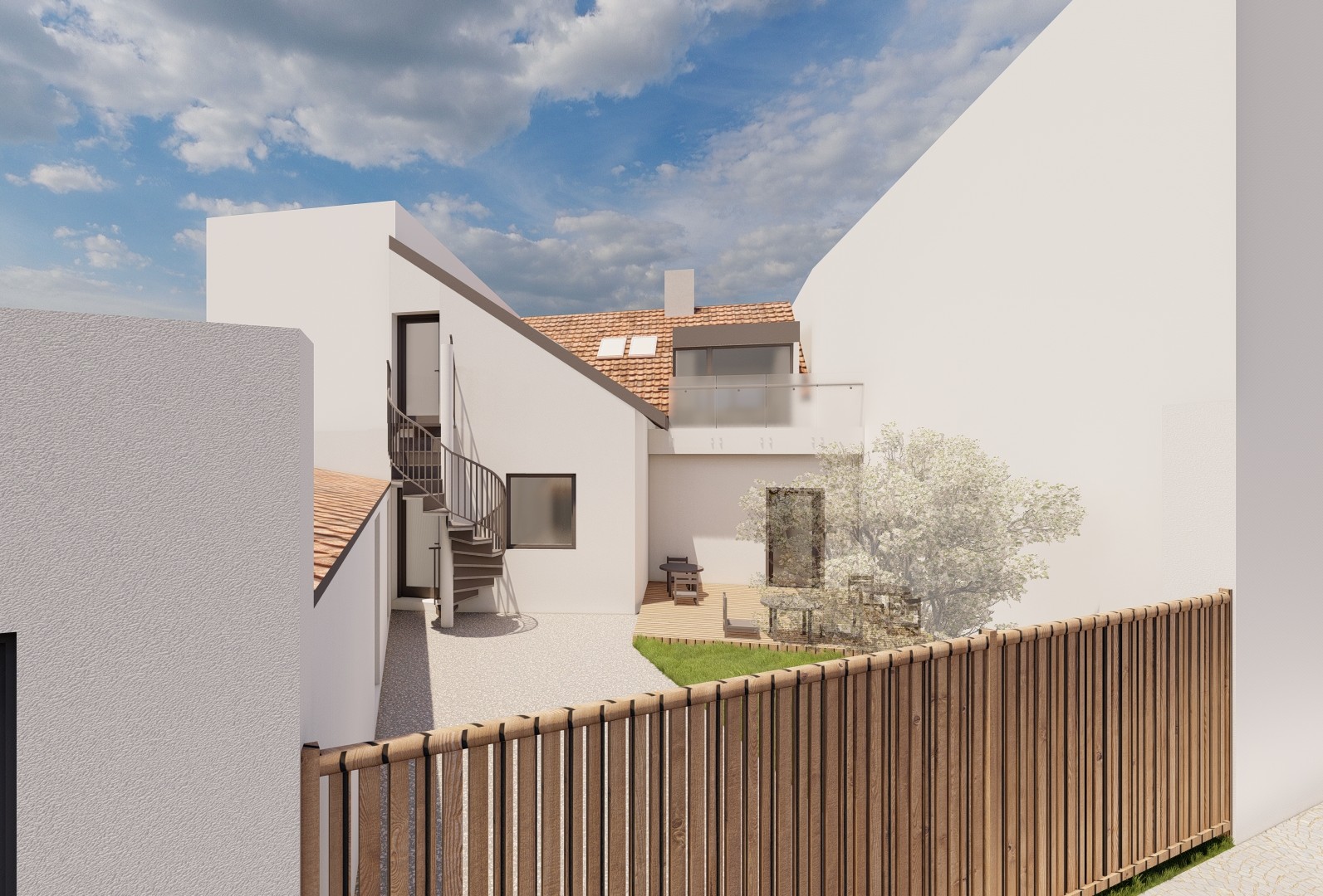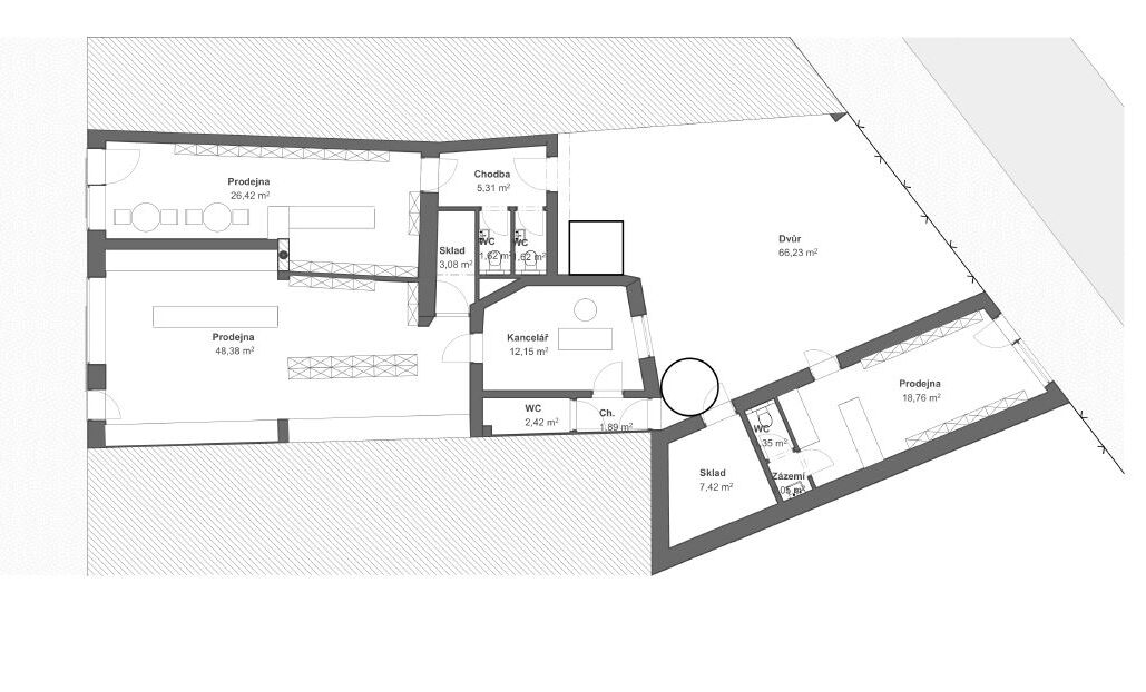 Přestavba původního řadového domu v historické zástavbě Bystřice pod Hostýnem se zaměřuje na obnovu dispozice, zvýšení prostupnosti světla a využití podkroví. Návrh vytváří tři komerční jednotky a byt v podkroví, doplněný vikýři směrem do ulice i zahrady. Očištění dispozice, akcentace masivního krovu a otevření obytných prostor podporují soudobý způsob užívání. Hospodářský dvůr se proměňuje v rekreační zahradu. Návrh uplatňuje střídmou barevnost a respekt k původnímu měřítku stavby.