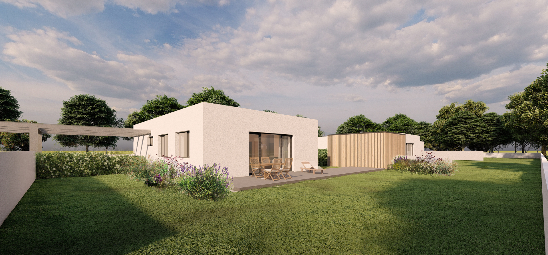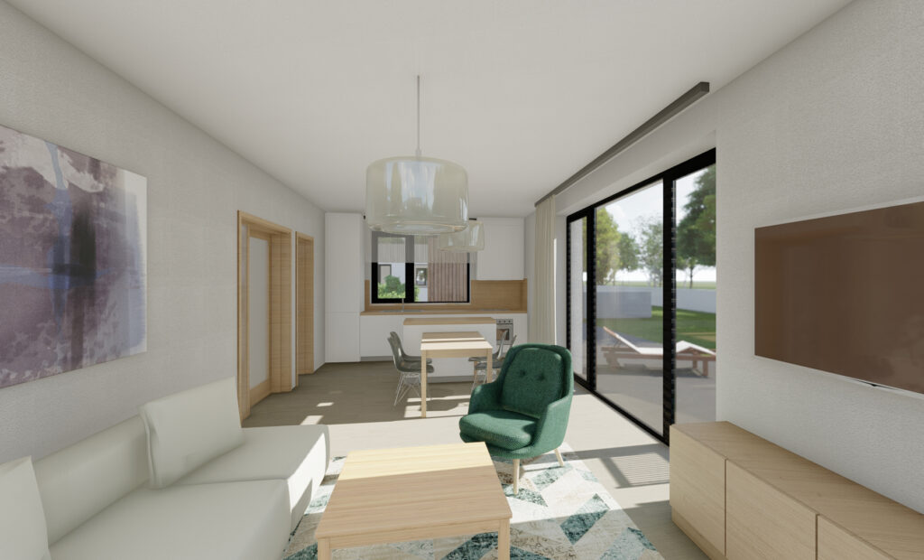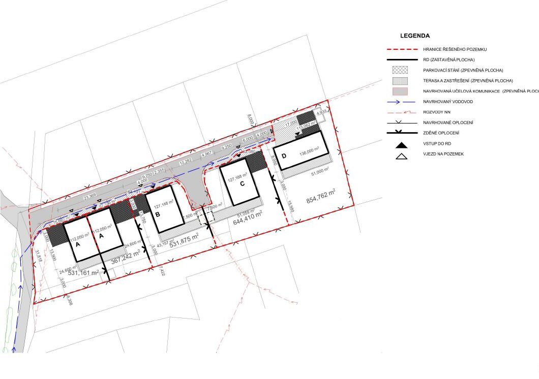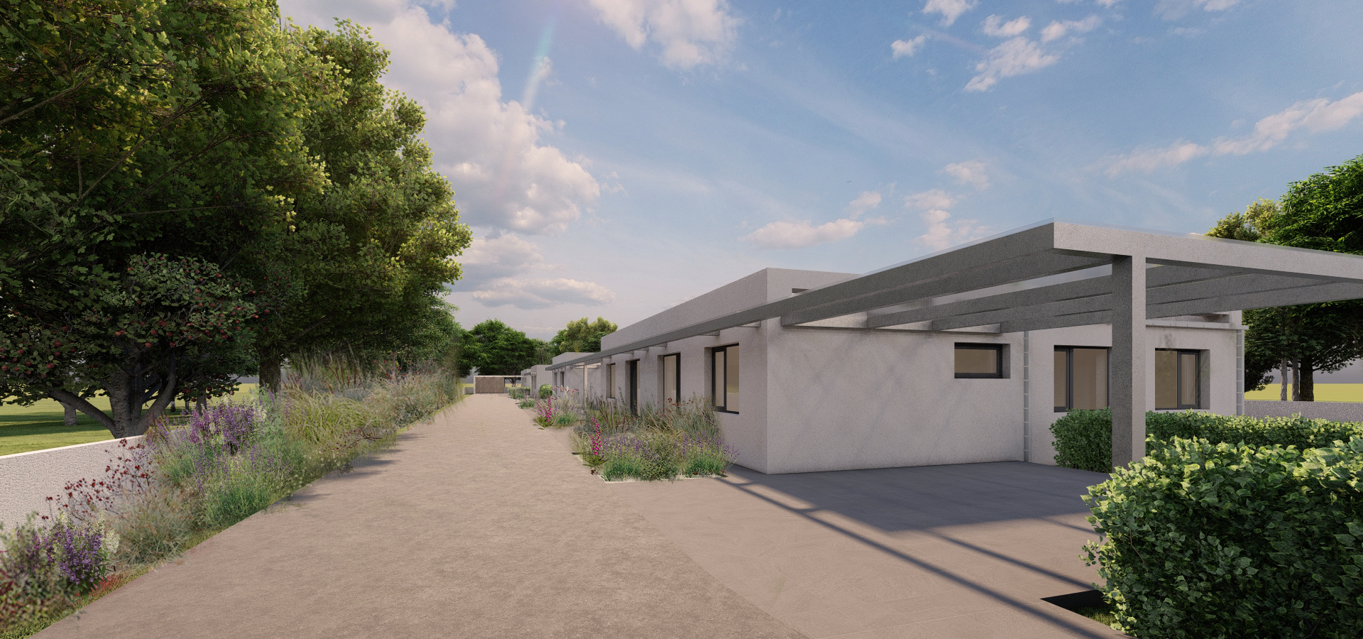 Zastavovací studie řeší skupinu pěti rodinných domů včetně jednoho dvojdomu. Koncept nabízí různé typy bydlení, reaguje na orientaci pozemků a podporuje individuální charakter zástavby. Jednopodlažní domy s pultovými střechami se otevírají do zahrad, disponují krytými vstupy a lehkými konstrukcemi pro parkování. Dispozice jsou účelné a podporují komfortní rodinné bydlení. Návrh přináší lidské měřítko do developerské výstavby a respektuje lokální urbanistickou strukturu.