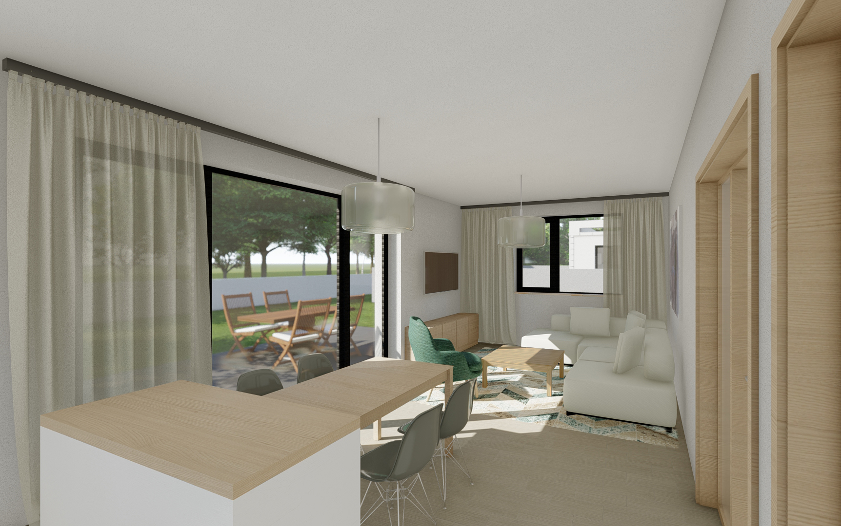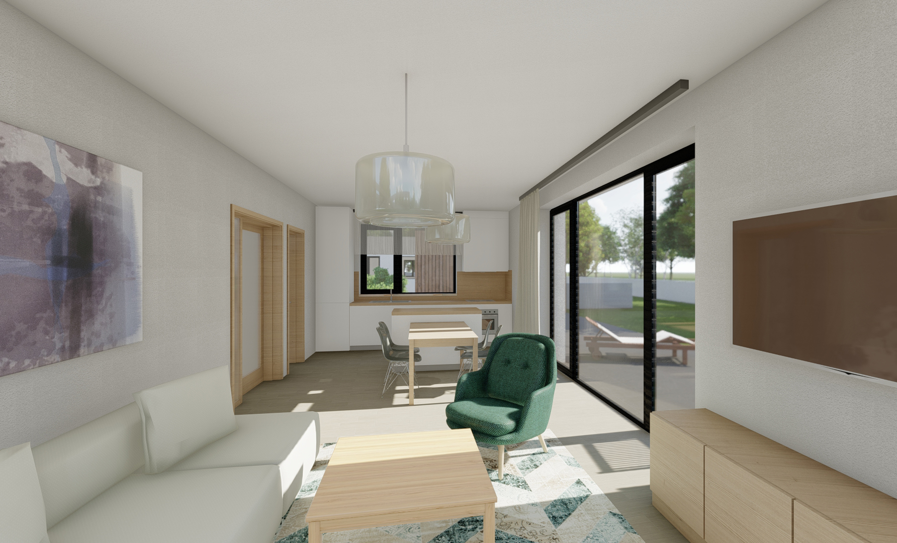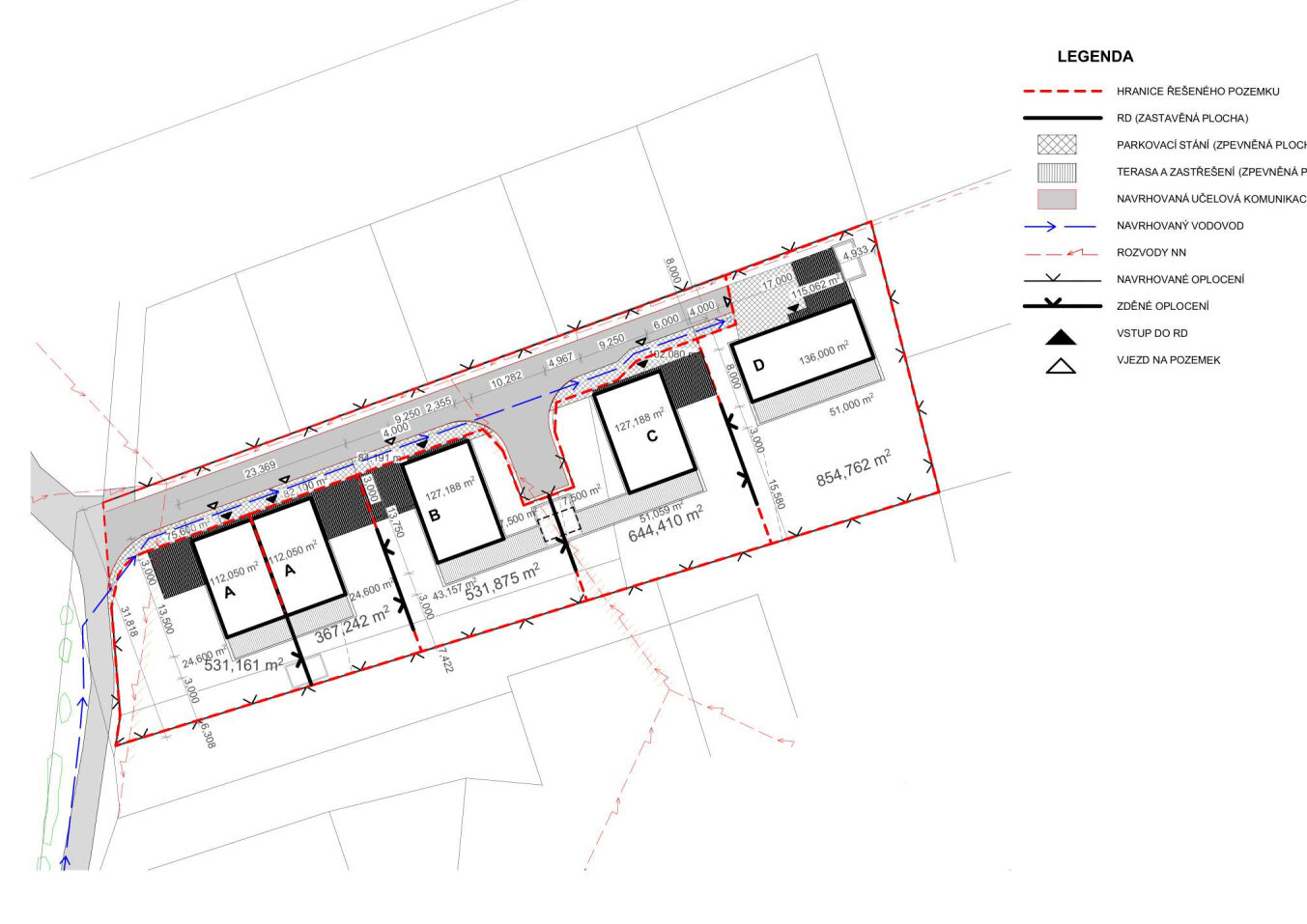 Zastavovací studie řeší skupinu pěti rodinných domů včetně jednoho dvojdomu. Koncept nabízí různé typy bydlení, reaguje na orientaci pozemků a podporuje individuální charakter zástavby. Jednopodlažní domy s pultovými střechami se otevírají do zahrad, disponují krytými vstupy a lehkými konstrukcemi pro parkování. Dispozice jsou účelné a podporují komfortní rodinné bydlení. Návrh přináší lidské měřítko do developerské výstavby a respektuje lokální urbanistickou strukturu.
