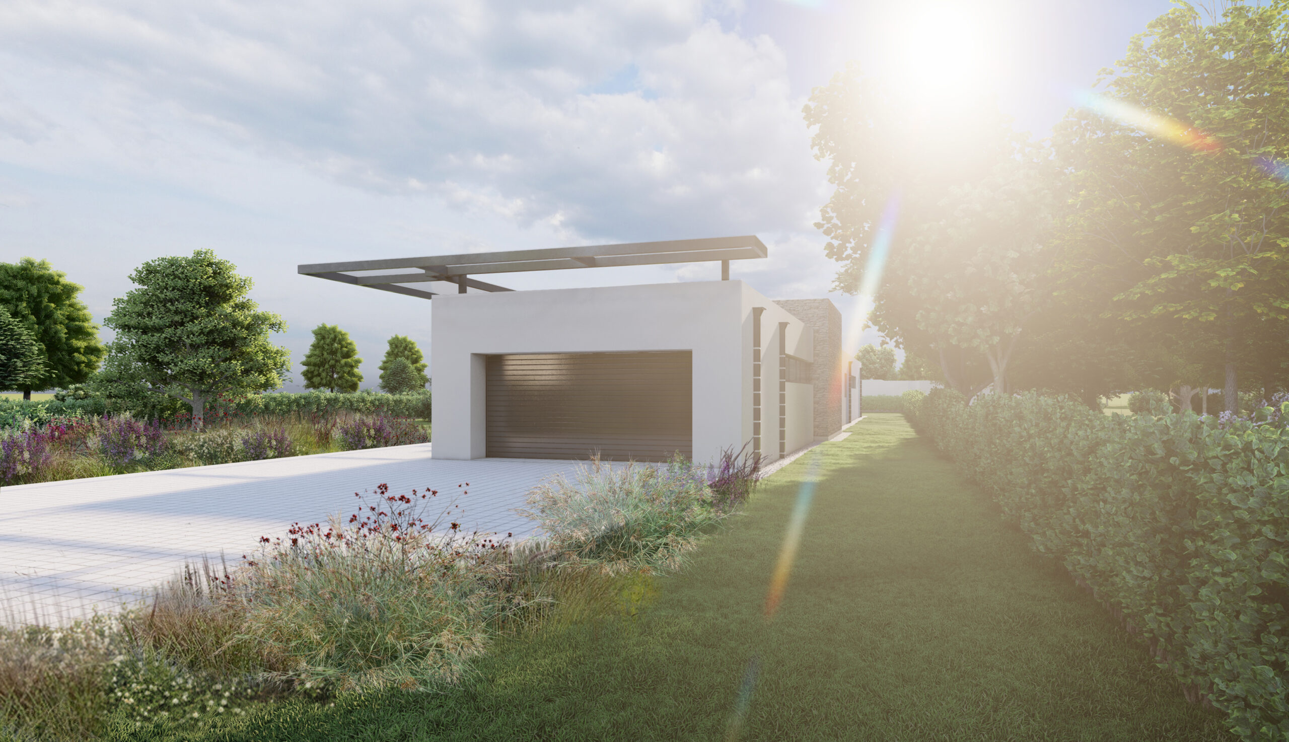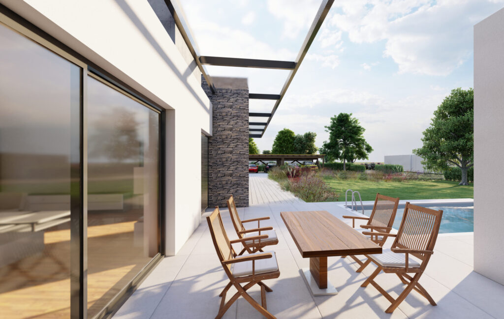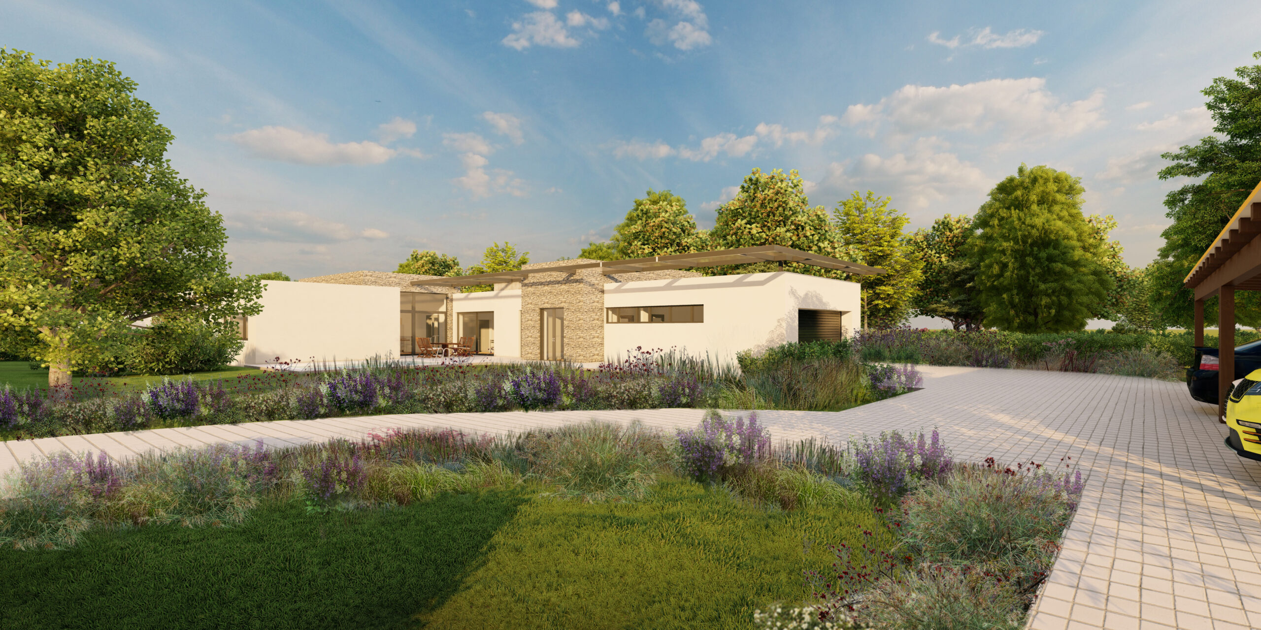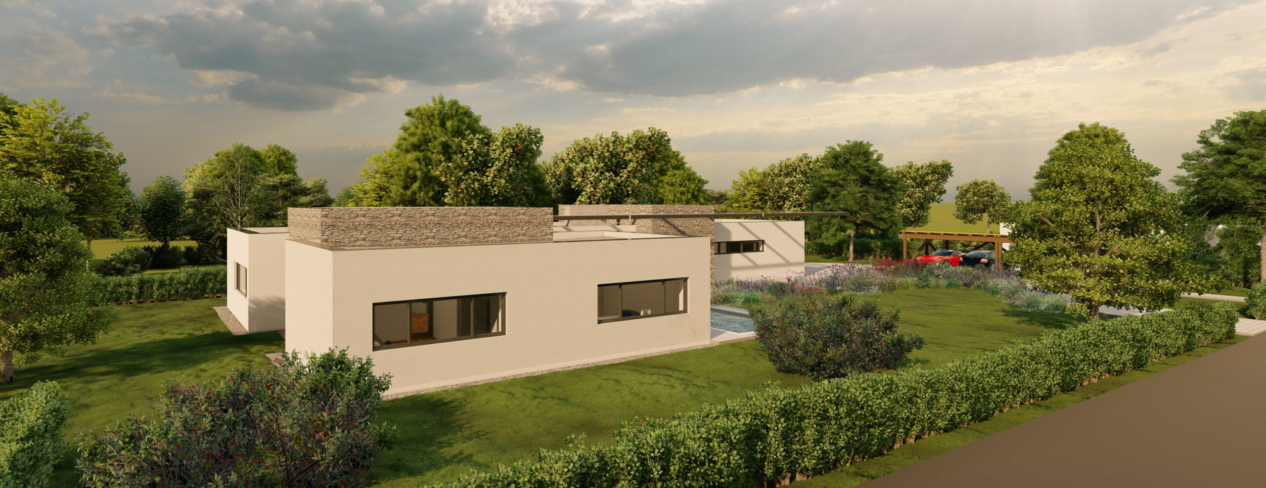 Novostavba rodinného domu je navržena pro celoroční rodinné bydlení s jasným oddělením společenské, privátní a relaxační zóny. Jednopodlažní zděný objekt tvaru L kombinuje pultovou a plochou střechu, doplněnou o lehkou předsazenou konstrukci západní fasády. Dispozice zahrnuje 1.NP s obytnou částí, dvěma pokoji, zimní zahradou a wellness. Návrh respektuje měřítko okolí, přirozeně navazuje na zahradu a rozvíjí možnosti současné rodinné architektury s důrazem na komfort a vizuální lehkost.