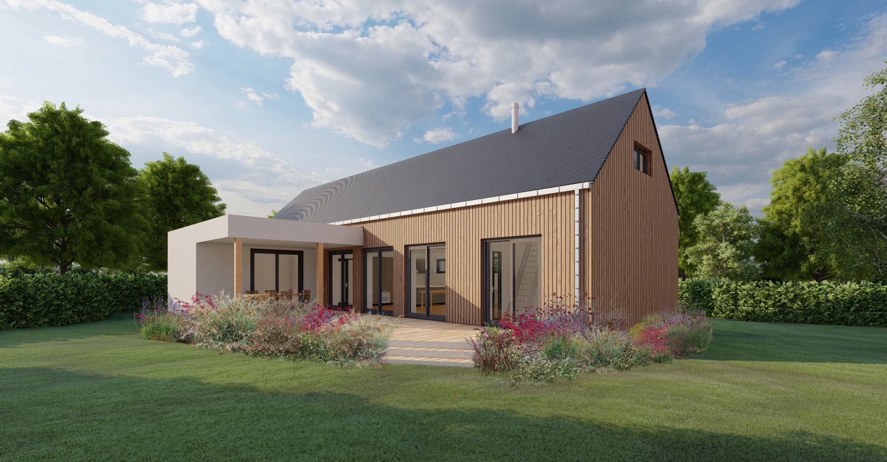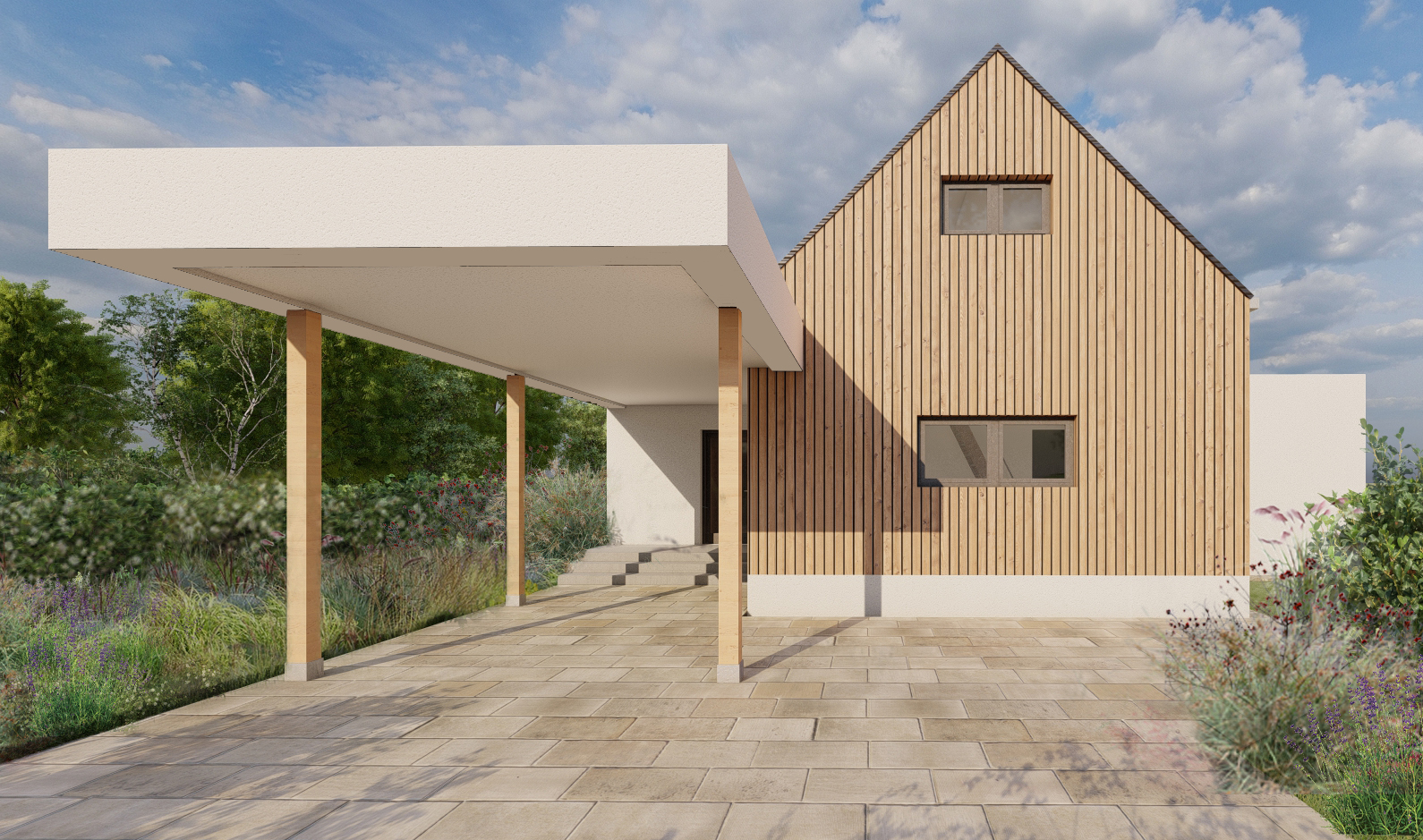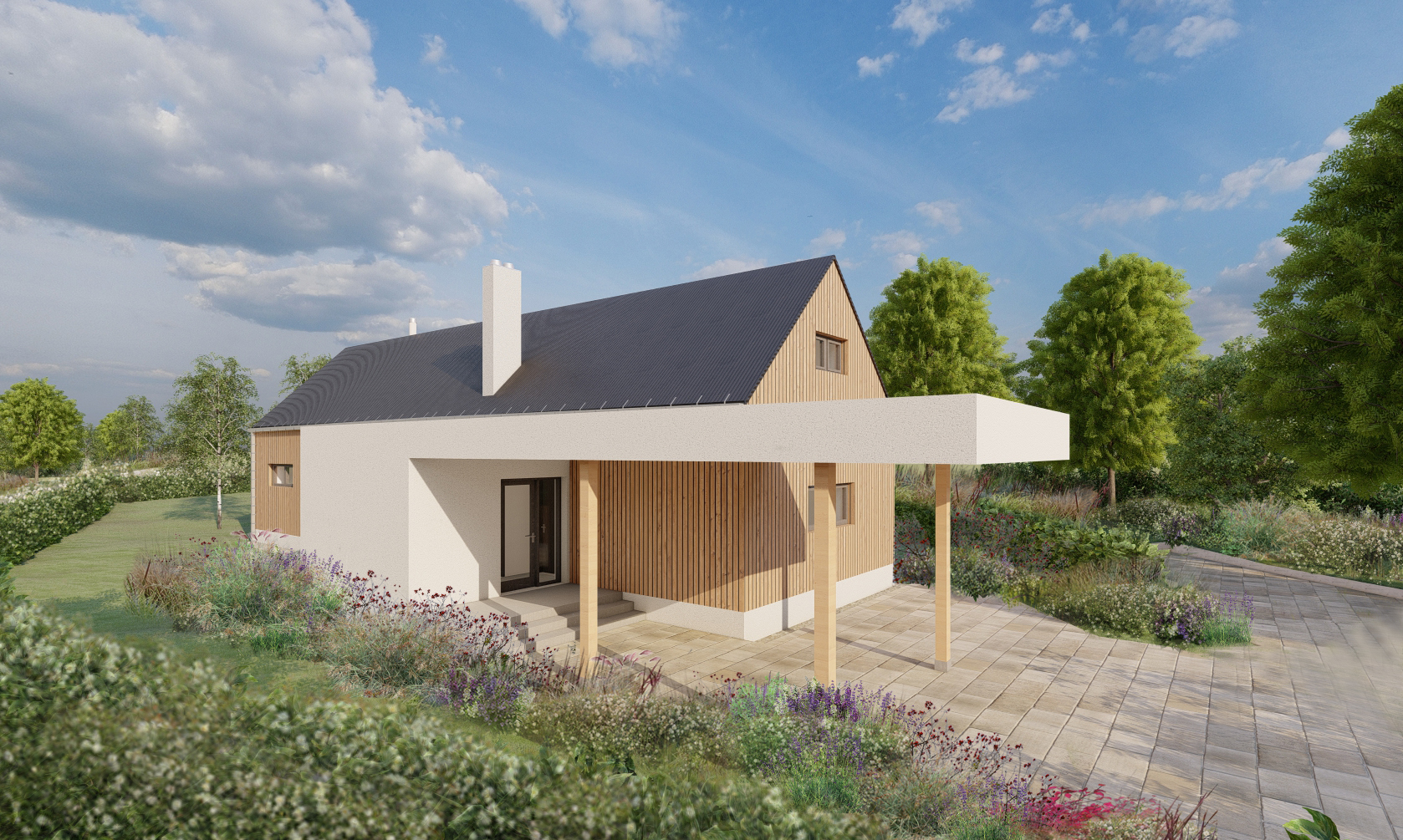 Rodinný dům je navržen jako jednopodlažní objekt se sedlovou střechou, založený na tradičním tvarosloví a současném pojetí dřevostavby. Konstrukce sendvičového typu s provětrávanou fasádou doplňuje výrazné vstupní zastřešení na dřevěných sloupech. Dispozice 6+kk s otevřeným stropem do krovu v obytné části zdůrazňuje prostorový komfort. Návrh citlivě pracuje s terénem, respektuje okolní zástavbu a využívá přírodní materiály pro vytvoření harmonického rodinného prostředí.