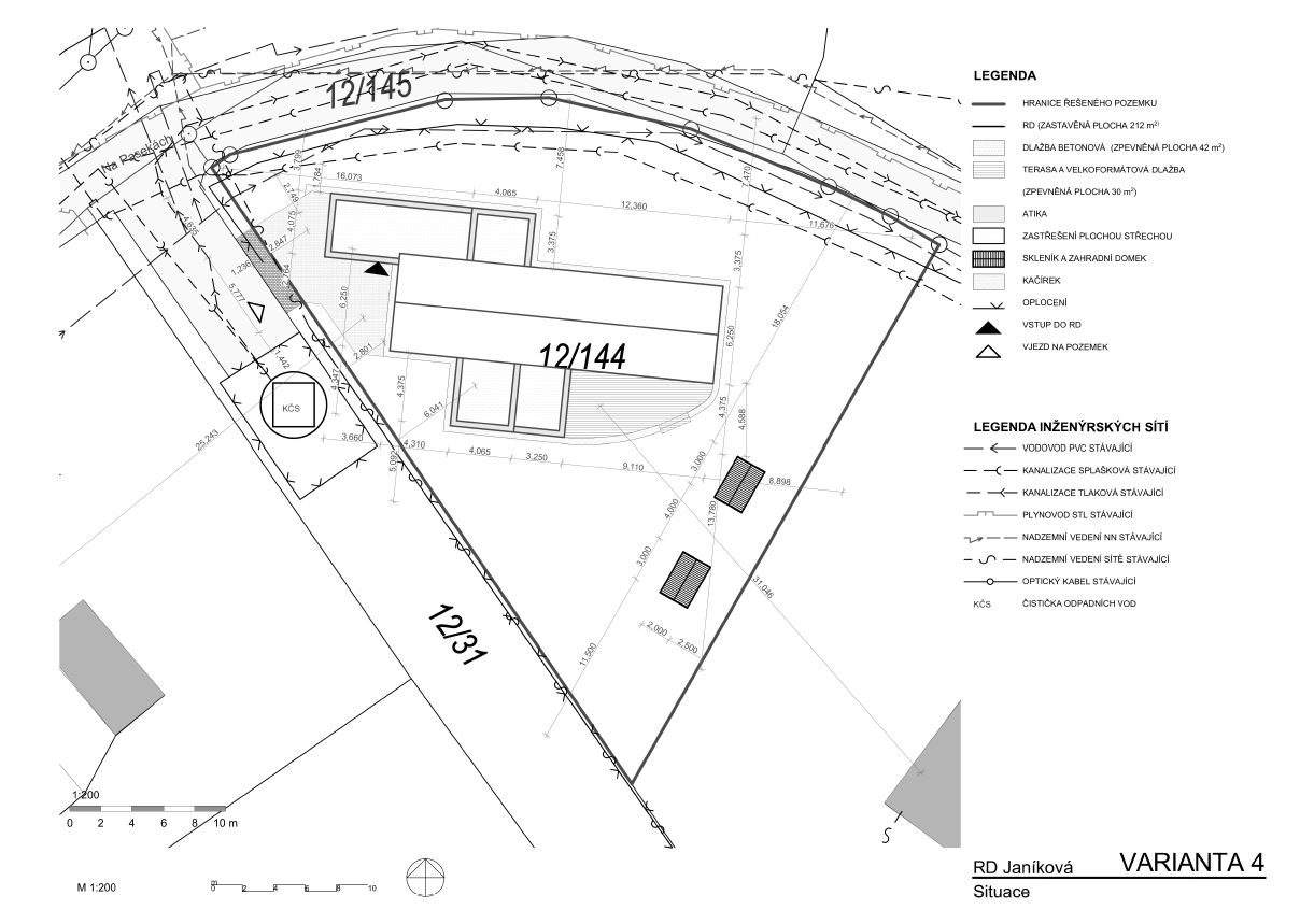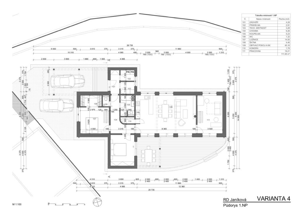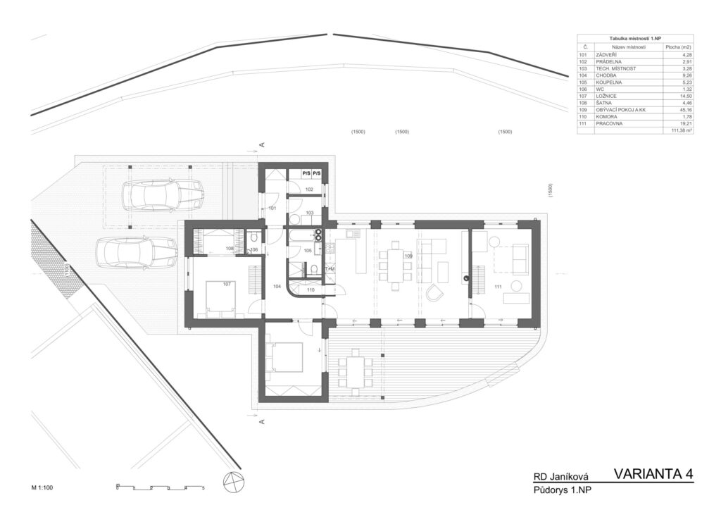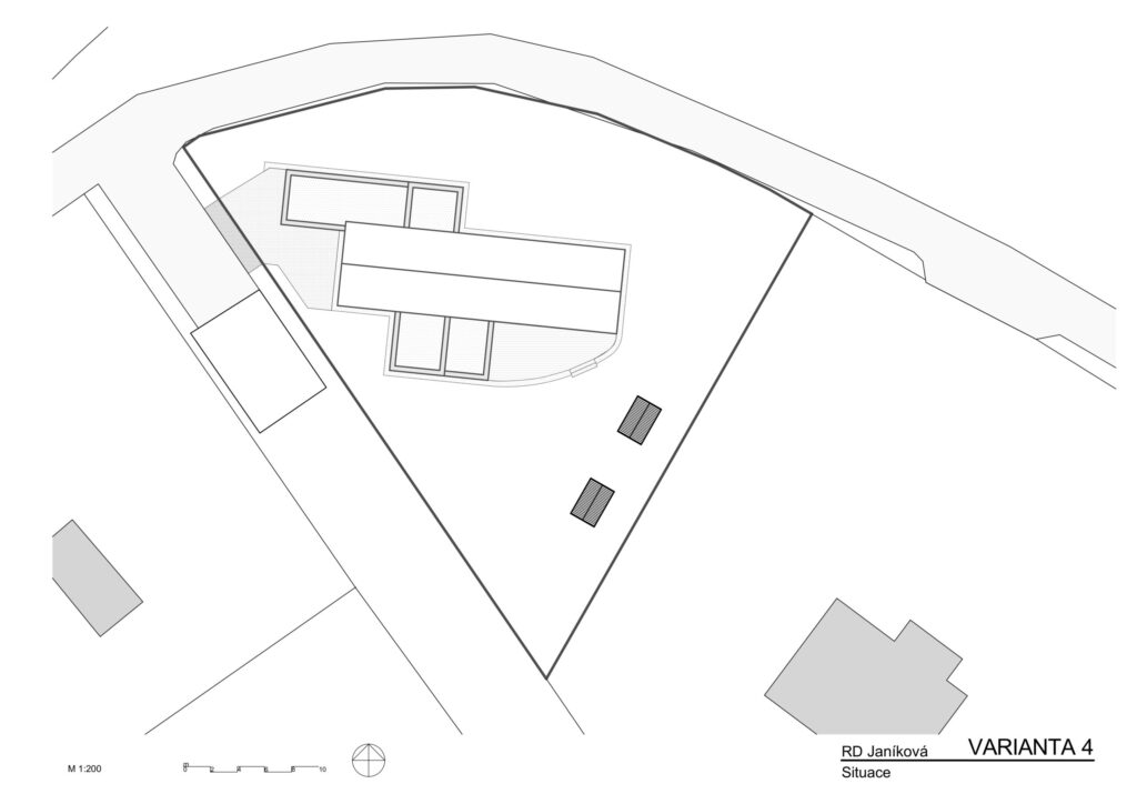 Rodinný dům je navržen jako jednopodlažní objekt se sedlovou střechou, založený na tradičním tvarosloví a současném pojetí dřevostavby. Konstrukce sendvičového typu s provětrávanou fasádou doplňuje výrazné vstupní zastřešení na dřevěných sloupech. Dispozice 6+kk s otevřeným stropem do krovu v obytné části zdůrazňuje prostorový komfort. Návrh citlivě pracuje s terénem, respektuje okolní zástavbu a využívá přírodní materiály pro vytvoření harmonického rodinného prostředí.